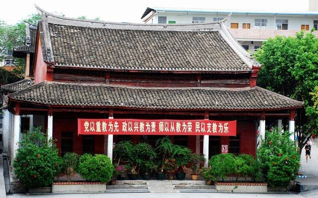 大觉寺,原名“祝圣大觉寺”,在梅州城西(今梅江区梅师附小内)。兴建于南朝梁普通三年(522年)。距今已有1480年的历史。历经三次重建,原寺为“三进”式,头门为“祝圣殿”,又称“前殿”;中间为“正殿”,又称“佛堂”;后为“后殿”,又称“后院”;左右两边为“廊”,分设“地藏厅”、“痘神厅”、“药王厅”等。正殿及前、后殿,自清末火灾后,尚基本保留。前殿直到建国后才拆掉,今仅存正殿(佛堂)和后殿;两廊各厅,早已在90多年前办学时改为教室。正殿与后殿,亦已经多次维修,但原貌仍依稀可辨。正殿、后殿,从外表看,仍是古香古色的寺庙特色。正殿门口对联仍然保存,是刻在门墙石柱上,上联是:“佛焕轮光说法衣传真觉地;”下联是:“堂开寿域祝厘经诵早朝时。”联首嵌“佛堂”二字。上款是:“道光辛丑春月毂旦”(1841年);下款是:“翰林院编修宰广西道监察御史弟子黄仲容敬题并书”。说明此联已撰作有164年之久。大觉寺现列为市级重点文物保护单位。