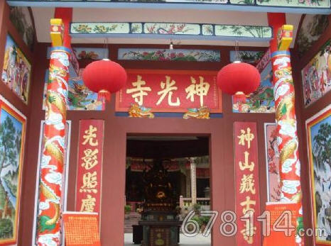 神光寺位於广东省兴宁市神光路,旧时称为南山寿庆寺,建於北宋嘉祐三年(1058年)。寺的创建有这样的传说:邑人罗孟郊在北宋天圣八年(1030年)上京城殿试,高中探花,官至谏议大夫、翰林学士。当时恰有一位朝廷大官贬谪潮州,途经兴宁县擁慧亭(即今福兴五里亭),远眺神光山,形如殿旗,与贵人峰相连,叹曰:此地现已出翰林控花,今后也应人才辈出,如能在南山上建一寺院,则锦上添花矣!於是在他了指点下,当地父老在山腰建一寺庙,命为寿庆寺。明朝成化年间,寿庆寺经过数百年的风雨,已显破漏。其时陈礼明任兴宁县令,留心文教,培育人才,於成化十五年(1479年)扩建重修寿庆寺,改南山为神光山,改寿庆寺为神光寺。