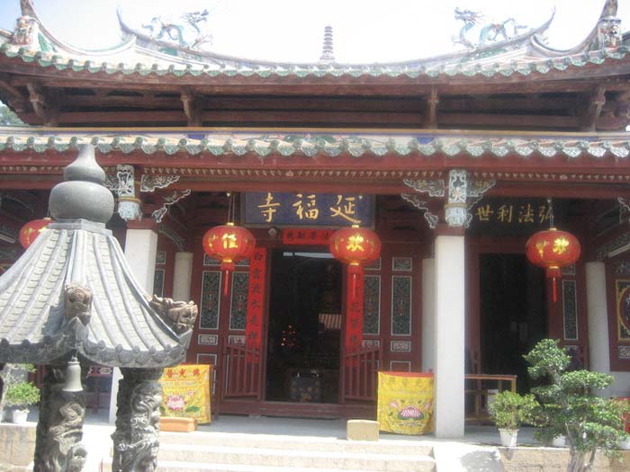 延福寺又名建造寺,位于南安丰州镇九日山下金溪畔上,建于西晋太康九年(公元288年),为福建省最古老的寺院之一。九日山三峰环抱如钳,东峰姜相峰,海拔112.8米;西峰为高土峰,海拔89米;北峰联结东西二峰。晋人南迁时定居晋江两岸,丰州又是闽南郡所,住的人更多。每年九月九日重阳节到这里登高遥望家山,沿袭中原习俗,饮菊花酒避灾,故山曰九日山。九日山为海上丝绸之路的起点之一,延福寺在当时为“祈风”盛典所在地。“自古名山僧占多”,延福寺因“九日”而兴建,成为禅林名刹。“佛法无边播四方”,九日山也因延福寺而名扬天下。