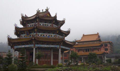 其中佛教区为重点建设区域,在中心主轴线区域内主要布置有:牌楼(山门)、天王殿、大雄宝殿、法堂、圆通殿、念佛堂、钟鼓楼(地藏殿、伽蓝殿)、迎寿殿、祖师殿等建筑;两侧布置有尊客堂、云水堂、居士楼、福德素斋、五观堂、僧舍等建筑。