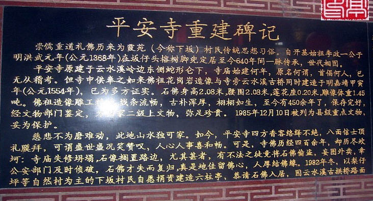 平安寺内屹立的一尊阿弥陀佛立佛石雕,造于明嘉靖年间(约公元1554年),距今446年,立佛石雕高2.28米(含底座,佛身高2.08米),腰围2米,重1.45吨,造型雄伟壮观,端庄慈详,古朴厚重,雕刻精湛,出神入化,是华安古石雕文化的宝贵遗产,是华安佛教艺术发展的一见证。