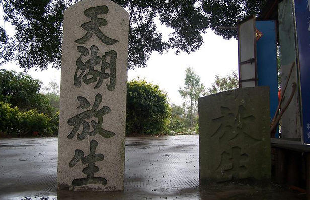 湖是放生湖,在水月亭对面坡下,是一个长方形的天然湖泊。湖边的残碑上书“天湖放生”四个大字,乃北宋端明殿大学士蔡襄任泉州太守时留下的墨宝。传说放生湖中有被称为“天湖三奇”的三种生物:无尾螺、红体虾和半边鱼。关于“天湖三奇”,民间有这样一个神奇的传说:明武宗朱厚照在此游览时,侍从捞起湖中鱼、虾、螺作为御膳,朱厚照知悉缘由后,愕然良久,深悔食了放生湖之物,亲自将残肴倒回湖中,对天祈祷:“佛祖有灵,当使半边鱼游碧水,熟红虾相嬉戏,剪尾螺又繁殖。”皇帝的金口玉言竟然使这些未食完的鱼、虾、螺起死回生,繁衍至今。对于放生湖的美好景致,前人有诗曰: