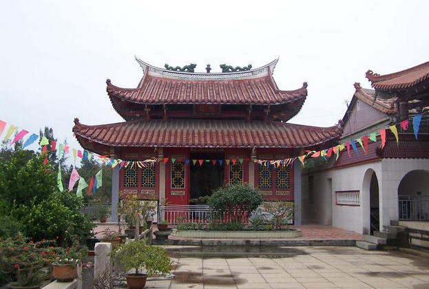 后殿是观音阁,只见双层飞檐高达10多米,棱檐翘翼好如巨鹏展翅,巍然屹立,气势雄伟。正中大门上的横匾有“观音阁”三字,笔锋雄厚有力,金字耀眼。殿内雕梁画栋,拱嵌着八角天花,突显出佛阁的庄严。正中莲花宝座上一尊高达5.68米的净瓶观世音塑像,慈眉善目,观音两旁还侍立着善才、龙女二童。左右墙两侧是二十四尊梵天王神像,皆有3米多高,姿态各异,栩栩如生。殿内有一联云:“梵宇耸洲中一水迎来台岛浪,法延启天末好风伴送海潮音”,把佛禅与景色融为一体,意境悠远。后殿的建筑面积达324平方米,门前有石埕,四周用石栏围护,埕前植有一圃花卉,四季皆有花香,沁人心扉。