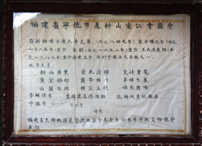 正由于安仁寺风光旖旎,殿阁宏伟。自宋以来,游人不绝,留下了许多文人墨客的题咏。南宋嘉定三年(1210),曾任柳州知州的东山人陈纪应寺住持通一之请,撰写修寺碑记。元至元十九年(1282)寺院重修,理学家韩信同受邀亲撰寺碑,碑文今仍完整保存于地方志中。明天顺元年(1457)任宁德教谕的江西鄱阳人李辅在游览安仁寺时,留有七律一首。诗曰:“翠微深处有袛园,门外惟闻鸟雀喧。兀兀楼台经岁月,钦钦钟鼓应朝昏。花飞春院奇香谒,云护珠林绿影屯。叠嶂层峦增胜概,依稀风景似桃源。”诗人通过细腻深入的观察,将安仁寺周围清幽动人的山水风光描绘得淋漓尽致。
