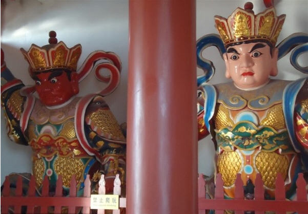大门两边横额题字眼,意谓佛国净土,装饰美盛。四大天王虎背熊腰,雄壮孔武。东方持国天王手持琵琶,护持国土;南方增长天王。手持宝剑,增长他人善根;西方广目天王,手中握蜃,护持人民;北方多闻天王,手拿宝伞,降魔施财。四大天王甲胄披身,威风凛凛,“风、调、雨、顺”四大天王反映出百姓祈求风调雨顺,天下太平的美好愿望。弥勒佛的背后即是韦陀天王,韦陀天王手执金刚杵,戴盔披甲,精神抖擞,神采奕奕。