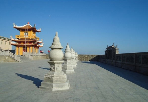 圆通宝殿两旁是钟鼓楼,面前是一排石经幢,个个精工细琢。站在圆通宝殿前面的围墙边,面前海潮澎湃,还真有一番“一波还未平息,一波又来侵袭”的意境。