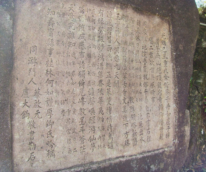 据考证,自建寺以来,历任县令无不登南山顶游览的。留下许多墨宝古迹,明代著名文学家冯梦龙,公元1638年--1642年任寿宁知县期间,曾多次登临绝顶,遗迹尚留,福建省第一位进士薜令之,唐神龙进士,也曾结芦南山,苦读成名,现读书处遗址尚存。