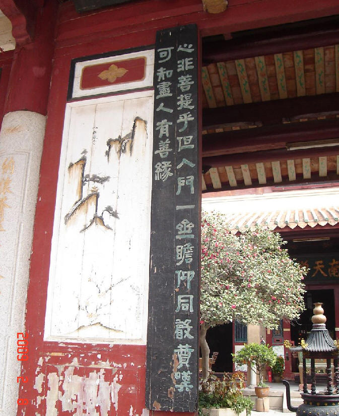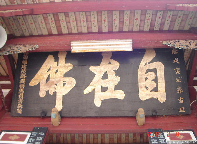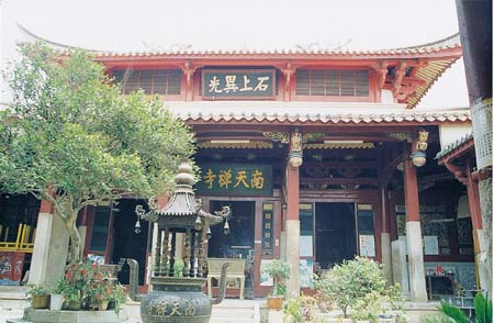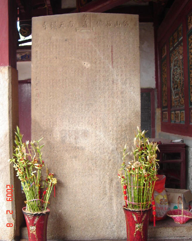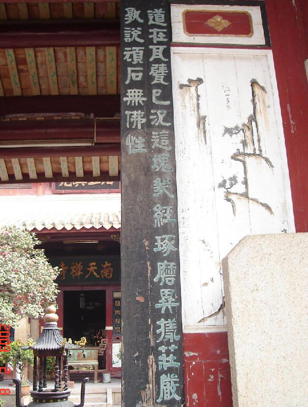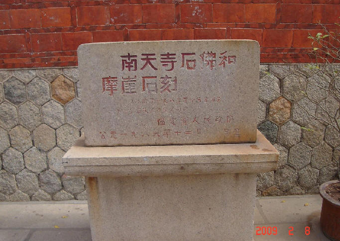 南天寺非仅石佛著称于世,且有崖刻佳墨蜚声于外。前殿额匾擘窠大字“自在佛”为清乾隆间状元及第福建陆路提督马负书所题,字高近1.6米,苍劲挺拔,气势雄浑,与巍巍大寺,相得益彰。大殿匾额“南天禅寺”乃清将军吴英所书,洒脱遒劲,亦是书法上品。楹联以明代诗人黄伯善所撰最为游人所赏识,其联云:“寂寞空门不贪金色相;慈悲菩萨原是石肝肠。以石佛特点入笔,立意新颖,颇蕴禅机。石壁上有僧镌一“ ”字,心中一点放下,旁题曰:“放下全无事,提起万般生。”不唯佛门警偈,更富含人生哲理。寺左岩上有圆石一珠,上镌“宝藏”二字;寺右摩崖巨石,刻有“泉南佛国”四字,每字高达2米,刚劲俊遒,或说为南宋泉州太守王十朋所书,或说出自僧人一庵净师之笔。清光绪间泉州知府李增蔚题刻“ 菘嶽降神”四字于其侧,圆满凝重,笔势稳健,亦为人所称道。