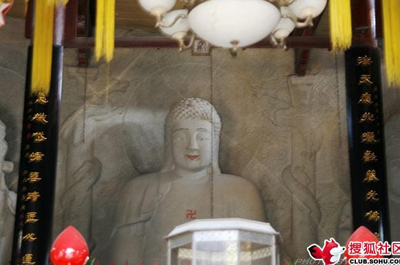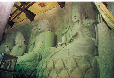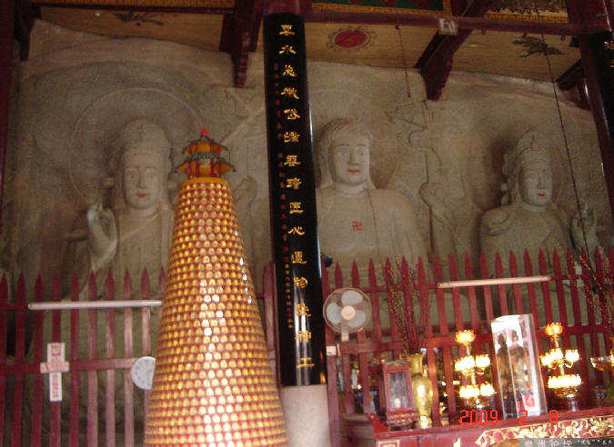 石佛雕于崖壁巨岩,一石三佛,雕就西方三圣。当中阿弥陀佛,发状螺髻,胸饰“ ”徽,双手叠置足上;左边观世音菩萨,头戴花冠,右手持净瓶,左手上举施说法印;右边大势至菩萨,头戴出缘云片花冠,左手执经书,右手亦上举施说法印。石佛高6米,宽3米,间距1米,均结跏趺坐于2米高莲座之上。体躯雄伟,宽袖袈裟,褶纹简劲。素面丰腴,两耳垂肩,慈眉善目,端庄矜持。佛像外浮雕一殿堂式佛龛,高7米、宽16米;两边各雕一蟠龙石柱,巨龙舒爪奋髯、缘柱腾升,矫首承托檐盖,前立剑条护栏,成内外殿形状。