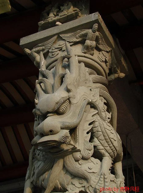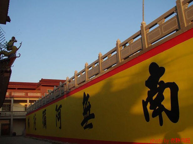 佛前,八根花岗岩石柱最为引人注目,每根柱子上都刻有金字,遒劲有力的笔峰,绝妙的文字,修饰着大雄宝殿。有种顶天立地的气势。屋顶的图案艺术,更是耐人欣赏。??