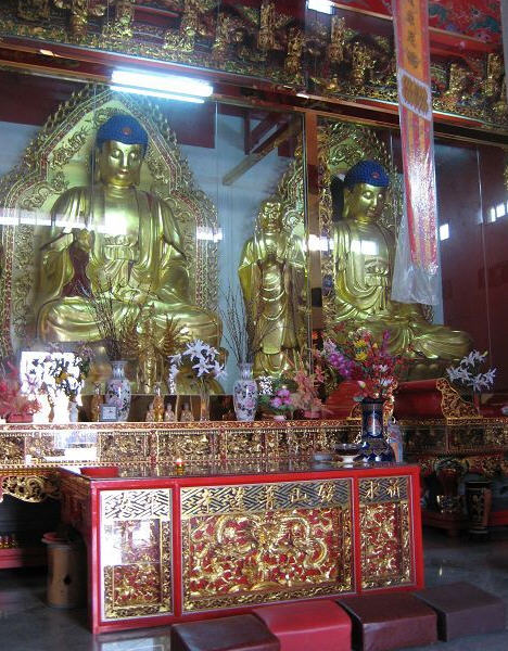 大雄宝殿高十五米,供奉着过去、现在、未来“三世尊佛”,倒佛,及万佛等。