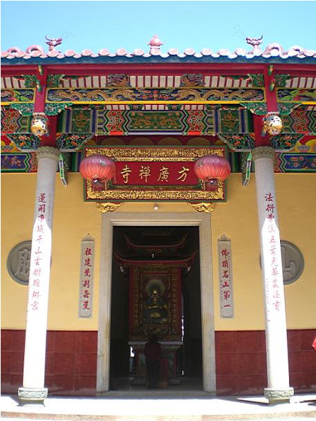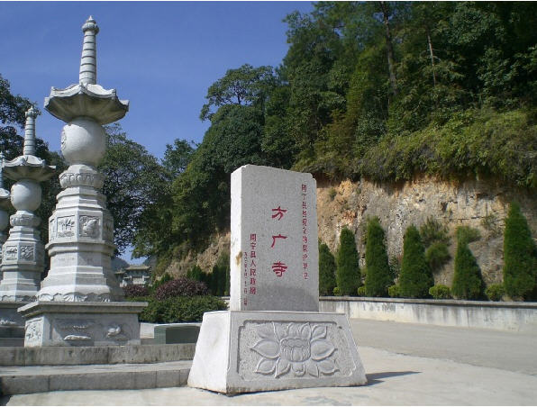 方广寺,似一位历史老人,经历着世事的风风雨雨,述说着沧桑的兴衰枯荣。已经成为周宁县文物保护单位的方广寺,九十年代经过全面改造修缮,扩充完善,原有殿宇既保留了传统风格,又体现时代精神。今天走进方广寺,迎面的“方广禅寺”四个大字苍劲有力,雄浑天然。由信徒们捐献的“自在亭”给人悠然自得之感;那挺拔巍峨的观音菩萨塑像,稳落在莲花心座上,令人陡生肃穆之意。相传有一黄姓墓陵,原葬于方广寺原址,因建寺之需,迁葬于离寺500米处,从此黄姓后代繁衍生息,兴旺发达,延传至今……我们来到墓陵新址,遥看前方,似乎望得很远很远……