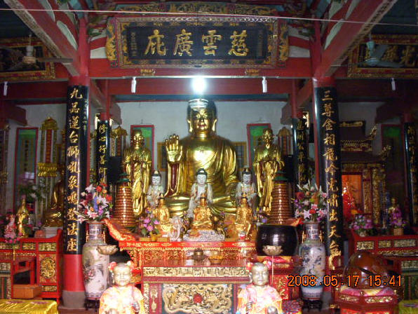 该寺的建筑物亦颇具特色。寺区采取以“天王殿”、“大雄宝殿”、“圆通宝殿”为中轴线的三进式的对称格局。在形式上,即保持传统的飞檐画栋,黄墙红瓦,呈现古色古香,又融进新兴的科学技术,引用新材料,蟠龙石柱浮雕,精致牌楼彩饰均给人以美的感受。