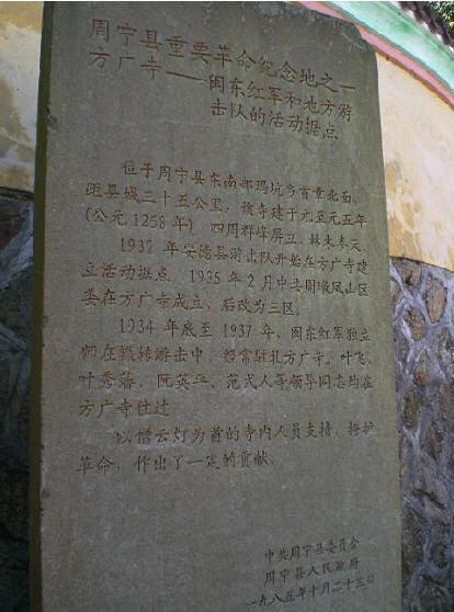 方广寺同时也是第二次国内革命战争期间闽东红军和地方游击队的活动据点,当时寺内僧尼均来自附近农村,早已不满反动统治和地霸掠夺,通过游击队地下人员的宣传,而更加向往革命,具有良好的群众基础;且地处深山密林之中,环境比较隐蔽,更适宜革命队伍的集散,因而被当地工农游击队和闽东红军独立师选为活动据点,当年独立师领导人叶飞、叶秀藩、范式人、阮英平等经常率队驻寺指导革命运动。1935年,中共周墩凤山区委在该寺成立。该寺的僧尼不仅不遗余力地为革命队伍提供食宿方便,还积极提供情报信息。有一次叶飞同志在方广寺时,因国民党兵突击包围,无法脱身,住持云灯法师急中生智,以袈裟披在叶飞身上伪装寺僧而脱险。1985年被中共周宁县委和周宁县人民政府确认为“周宁县重要革命纪念地”当年10月立碑。