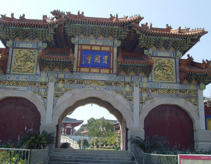 资国寺为福鼎原六大寺之一。现总体面积 100 多亩,常住僧众 100 多人。位于福鼎市东南郊,距城五公里的莲蜂山上。因山状似莲花,素有“莲花曙月”之美称,为桐城八景之一。建于唐咸通元年( 860 )。寺为唐冠庄叶庞兄弟所建,并施舍周围所有山场。宋代大全祖师重兴,相传有九井十三墩,为鼎盛时期。明代重建法堂,明代中期本邑玉塘夏姓一支系施白金一百两助建大雄宝殿。清乾隆年间,重修祖师殿。光绪十六年( 1890 ),兴建伽蓝殿。资国寺在一千多年的历史长河中,波澜起伏,几经兴衰,其沿带与佛教的盛衰息息相关。尤于“文化大革命”期间,殿宇被严重毁坏。落实宗教政策后,圣训老法师返回该寺,率僧众整顿寺宇,重修大雄宝殿,兴建念佛堂、五观堂等。 1987 年,由上海龙华寺方丈明旸法师倡议支持,重建天王殿。 1993 年兴建玉佛殿法堂,几经修建,重展千年古刹之风貌。现存大雄宝殿,占地 220.4 平方米,仿明木结构,面阔五间,进深四间,歇山顶,覆莲花式柱础,寺内有宋香炉两只,政和二年施食、七年( 1125 )石斛各一个,唐、宋井各一口,元丰六年( 1083 )碑刻一块。还有“灵泊洞”、“卧陀岩”、谈经台“等石刻。