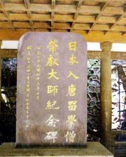 1963年 肇庆 荣睿纪念碑 位于肇庆市鼎湖山莲花峰的山麓登山曲径旁,前临天溪。1963年建。碑坐向东偏北37度,正对荣睿大师故乡日本美浓。碑高2米,宽1.2米,端砚石制作。正面碑文楷书,文为:“日本入唐留学僧荣睿大师纪念碑,公元一千九百六十三年十月鉴真和尚逝世一千二百周年纪念委员会敬立。”背面为赵朴初题的《荣睿大师赞》,行书:“矫矫睿师,卓起东陆。倾心弥天,绍愿长屋。十年唐土,行坚志笃。诚感法宗,气惊群俗。屡遘蝇藩,再踬蛟窟。中道舍身,遐方委骨。形谢精存,山川吐馥。智炬东流,命终不辱。功施两邦,永灿朝旭。勉我后人,追彼前躅。”