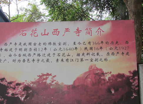 石花山西严寺是台山市古老的佛教宝刹,至今己有369年的历史。西严寺始建于明朝崇祯12年[公元1640年]。建寺于台城西郊[今西严路]西严路由寺名而得路名,当时建有大雄宝殿,祖师殿,淸康熙廿十二年又大兴土木,扩建寺观建有大悲殿等。民国16年[公元1927年]当时县长余仲仁推行市政建设,集县乡善信海外侨民资助,西严寺由台城西严路迁建于台山风景八景之首的石花山。据[新宁县志]和有关西严寺现存史料记载,原西严寺建筑宏广寺观宏大,时被称为吾邑寺宇之最。