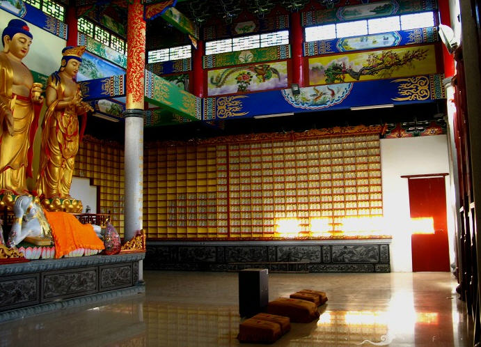 寺院内大雄宝殿飞檐斗拱、画栋雕梁、金碧辉煌。藻井上绘有两只色彩斑斓的老虎,游客不管从哪个角度去看,老虎的目光总是注视着自己,可谓虎视眈眈。另有佛楼、齐堂、寮房各一座,建筑面积460平方米,寺廊前有四根高大粗壮的石雕龙柱,出自闽南石雕艺人之手,工艺精湛,价值很高。