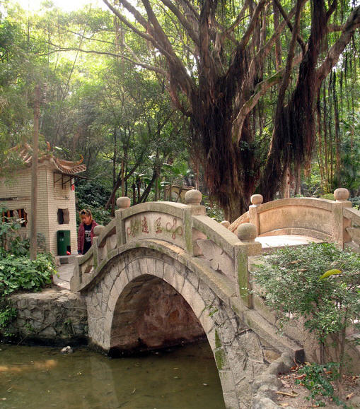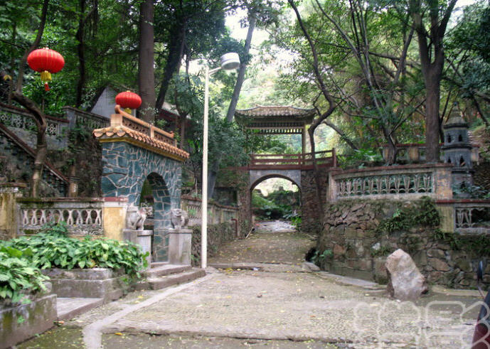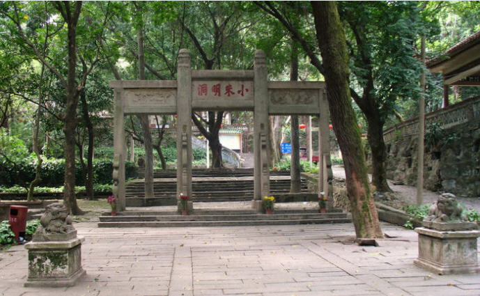 茶庵寺前面不远,立着一座古色古香的牌坊,上刻有"小朱明洞"四个大字。原来"朱明洞"是罗浮山的一著名景点,人们认为此地可与罗浮山的"朱明洞"相比美,并具有自己清静幽雅的特色,因此称为"小朱明洞"。牌坊的背面刻有"佛境"两个大字,游人到此,顿感已步入凡心清静之佛界了。