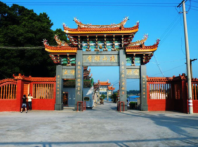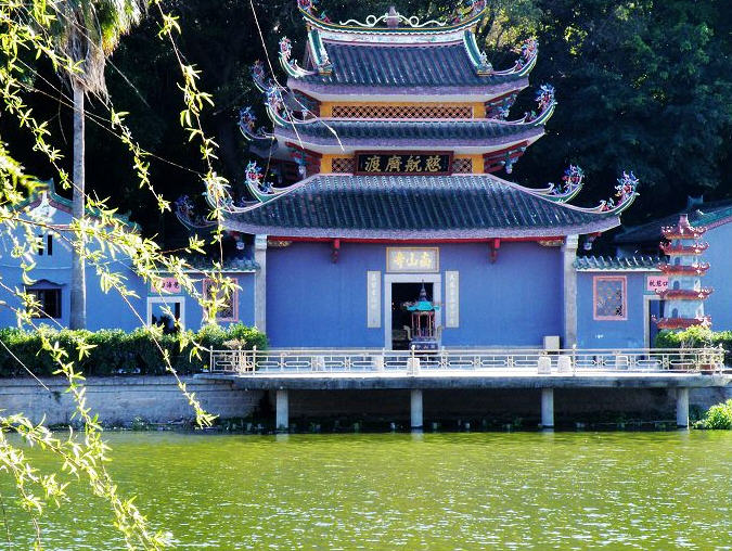 南山北麓有一座驰名闽粤的南山寺,本县的西溪就流经寺前东去,与东溪合流入海。寺前自古有一渡口,谓横岭渡,是诏安至饶平县一带路所必经之处,故寺又称渡头庵。寺始建于五代,迄今已有1000余年历史。《县志》称:“五代时,潮人黄九郎舍田入南山寺,寺僧祀黄九郎为檀樾,主于此。”庵历经风雨,曾屡次重修。“文革”期间遭人祸和火厄。1978年始重建。1985年再次由闽粤、台港澳、南洋及美国等海内外信众捐集巨资重修后,寺宇巍峨,飞甍雕栋,金碧辉煌。寺于1987年列为县级文物保护单位。