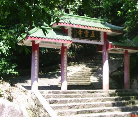 五云山峰有五支小山向山麓延伸,春雨初晴,云雾环绕山巅,故曰五云山。五云寺于明初洪武年间净土禅师创建,后人称他为“开山净师”。当时净师云游九州,传播经典,夜宿水潮。他清晨眺望五云山,微云飞挂,山水灵秀,气势磅礴,觉得是建寺庙的宝地,便选择风光秀丽之处建之。古刹居于半山腰亚热带雨林中间,上下古寺三座,上曰紫摩、中曰松柏、下曰五云,古寺周围岩石错落、岩洞别致因此称“五云寺”亦称“五云岩寺”。