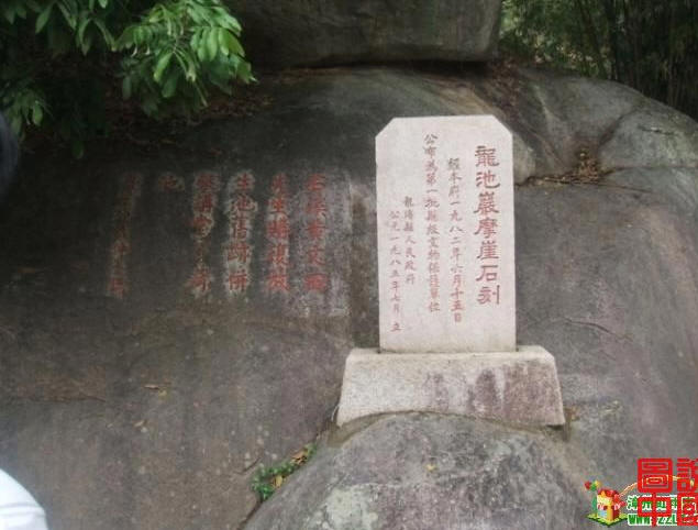 龙池岩摩崖石刻碑记: 龙池岩位于龙海角美白礁村的文圃山南麓。相传唐武宗会昌四年(884年)太子李忱随高僧断济禅师云游至此,见文圃山池塘石凌泉冽,解衣畅浴,暑气全消,赋诗云:“惟爱禅林秋月空,谁能归去宿龙宫。夜深闻法餐甘露,喜进莲花世界中。”因“真龙”入池,故名龙池岩。
