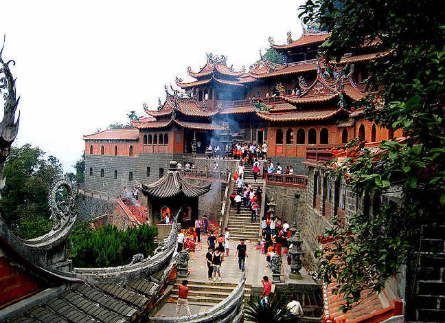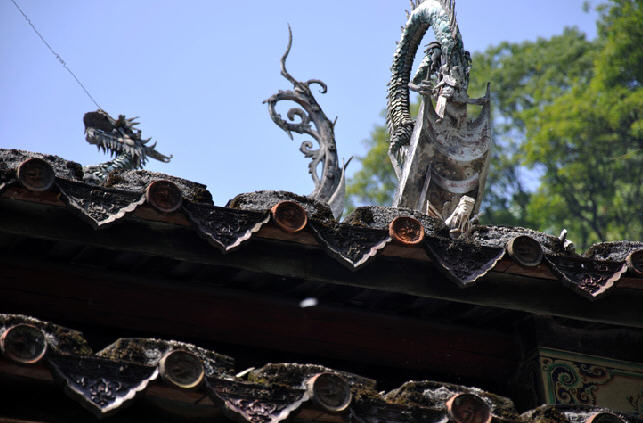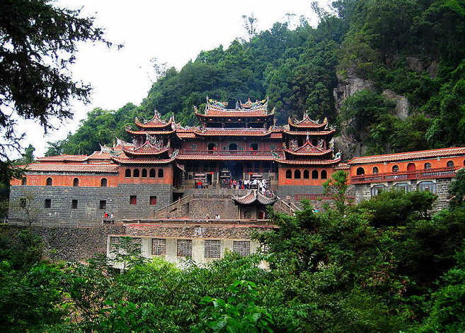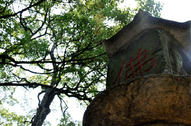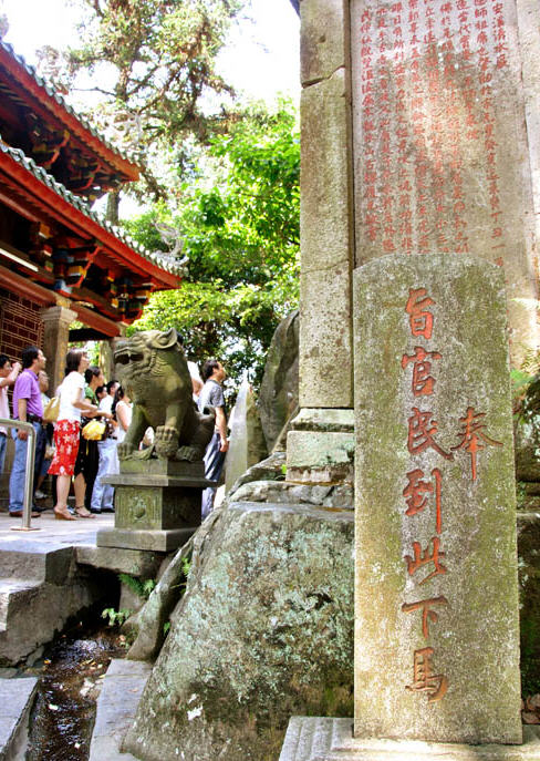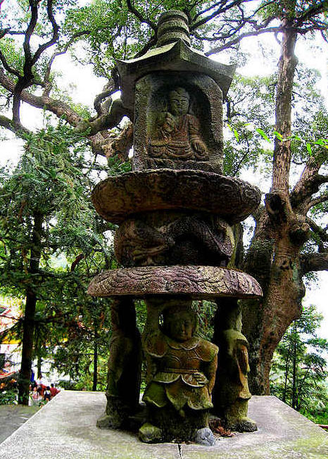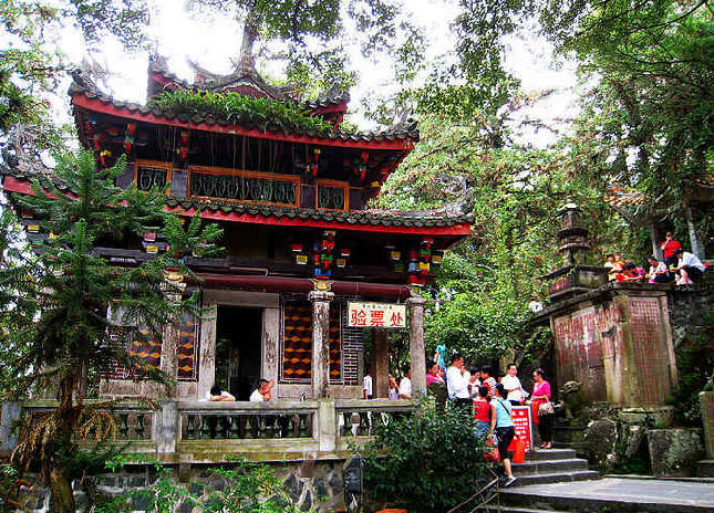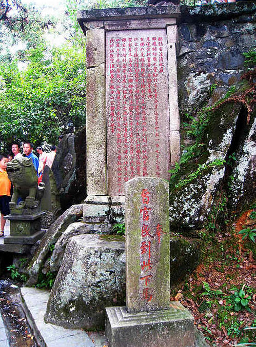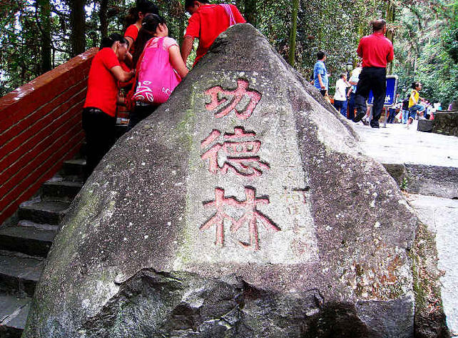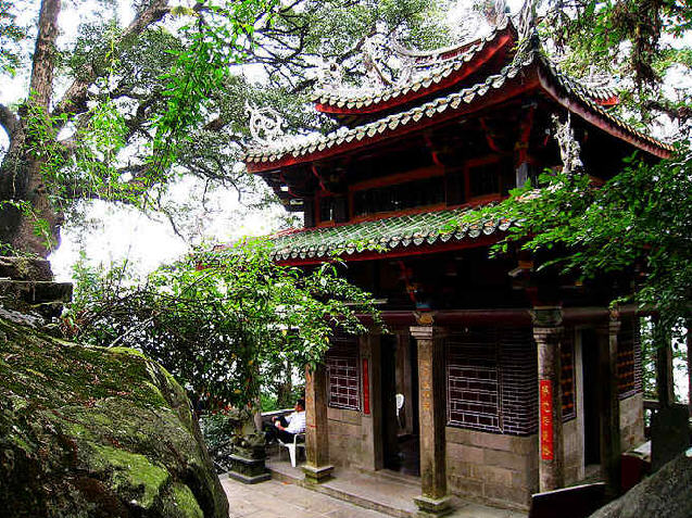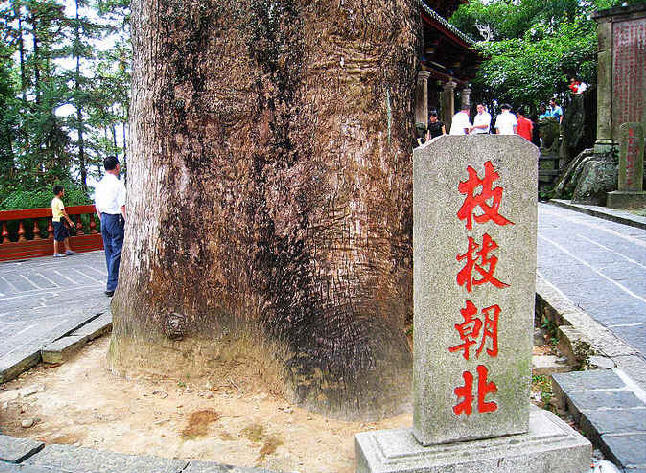 由此再攀登,即到“护累宫”。这里杉木擎天,林荫夹道,别有天地。继续漫步而进,顷刻便到“觉亭”。此亭原名“来憩亭”,今已仅存石柱两根。但樟树森荫,景物醉人,确为游人小憩佳地。“觉亭”一侧,有一株擎天老樟树,树身粗壮,可七人合抱;最奇特的是树干劲直,枝叶朝北,号称枝枝向北”。离树不远还有座“三忠庙”,是供祀岳飞的,游人多于此题诗寄情。