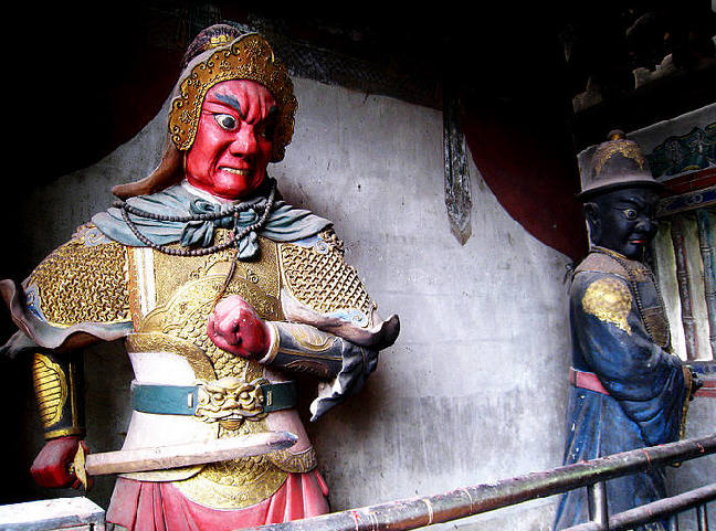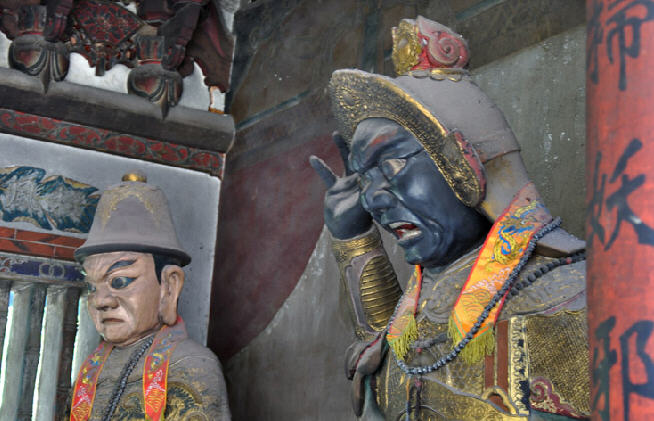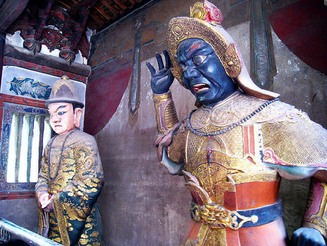 清水祖师料定山鬼不但对自己不会善罢甘休,而且还会危害四方百姓。他决定收服山鬼,便脱下袈裟,展铺于地,独坐袈裟当中。众山鬼轮番拽拉祖师,想把祖师拖出袈裟。但是,费了九牛二虎之力的山鬼,个个满头大汗,气喘嘘嘘,祖师仍岿然不动。祖师走出袈裟,问山鬼敢不敢入坐袈裟?山鬼自恃祖师奈何他们不得,留四名彪形山鬼盘踞袈裟四角,其余便一齐进入袈裟。这时,祖师忽然将袈裟四角提起,捏拢成袋子,用力一摔,将收进袋中的山鬼全部摔死。四个盘踞在袈裟四角而捡了一条小命的山鬼,畏惧祖师法力无边,哀求祖师饶命,发誓永不作祟,并愿效劳祖师。祖师收服他们为殿前护法神。这就是岩宇法门内赵、王、苏、李四大将的来历。