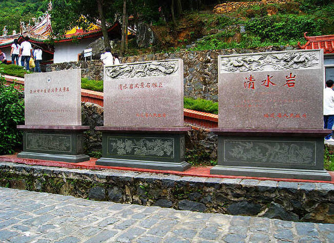 安溪清水岩在安溪县莲莱乡, 原名张岩山,始建于北宋元丰六年(1083年),元祐七年(1093年)清水祖师改为清水岩。清水祖师原名陈普足,从小落发为僧,修身、圆寂于清水岩,平生做了修桥造路,为人治病等许多善事,称为普足禅师。后人为了纪念他,谥称为清水祖师。清水岩宇几经圯废,几经修复、重建、改造,规模渐大。至明嘉靖四十三年(1564年),清水岩的僧尼,相传多达七八十人,颇为兴盛,宇区的风景也更加宜人。岩宇亭台耸立于蓬山之麓,奇林怪石散见于山巅水涯,为闽南著名的名胜古迹之一,省级文物保护单位。