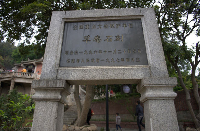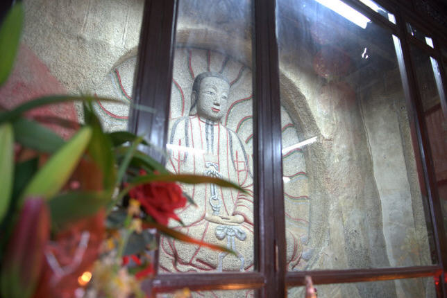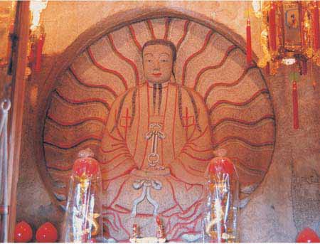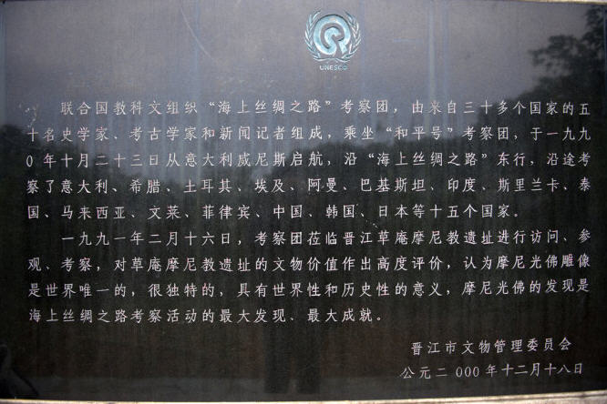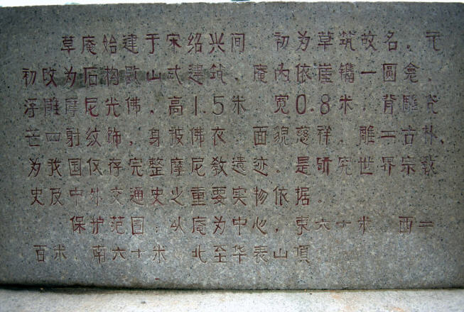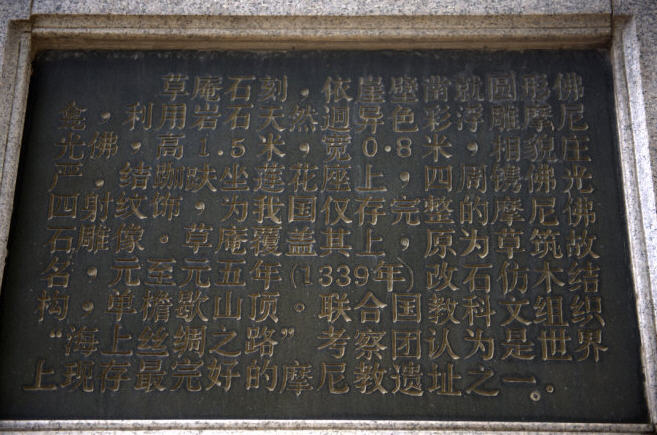 庵内依崖而镌波斯摩尼光佛浮雕一座。在摩尼光佛周围刻着直径为1.9米的圆圈佛龛,圈内摩尼佛高1.52米,宽0.83米。面貌慈祥,眉弯隆起,颚下两条长髯,脸呈草绿色,手为粉红色,由岩石中的不同颜色雕成,风格迥异。身披佛裳,结带为扣,双手掌心向上,结跏端坐莲座之上,背雕毫光四射纹饰,保存完好。脸、身、手巧妙利用岩石本身三种天然色泽构刻,背雕毫光四射纹胸饰,甚为奇特。龛外题刻至元五年“谢店市信士陈真泽立寺,善捨本师圣像,祈荐考妣早生佛地”。这是我国目前仅存的摩尼教石刻佛像,也是世界上迄今所发现最完整的摩尼教遗址。此佛像被首届国际摩尼教学术讨论会作为会标。它使联合国“海上丝绸之路”考察团的专家、学者考察后赞叹不已。考察团团长迪安博士说,这是“海上丝绸之路”考察全过程最伟大的发现。它被列为国家级重点文物保护单位。