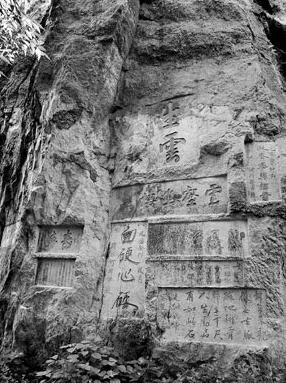 慈云岩位于春湾中山公园内,是阳春著名的古迹之一。从公园门口牌坊进园,便可见到屹立于右前方,浑穆端庄,卓拔挺秀的慈云岩。岩前高台上建有慈云寺,寺中立“三圣”塑像。殿后、壁上的石刻题字有20多帧,高低错落(见图,龙敏摄),大都是清朝中期至民国时所刻,与通真岩、崆峒岩石刻同属阳春摩崖石刻艺术的珍宝。从寺左面的阁门进去,沿石阶上10多级,有一石窟叫观音阁,内有数尊观音塑像。
