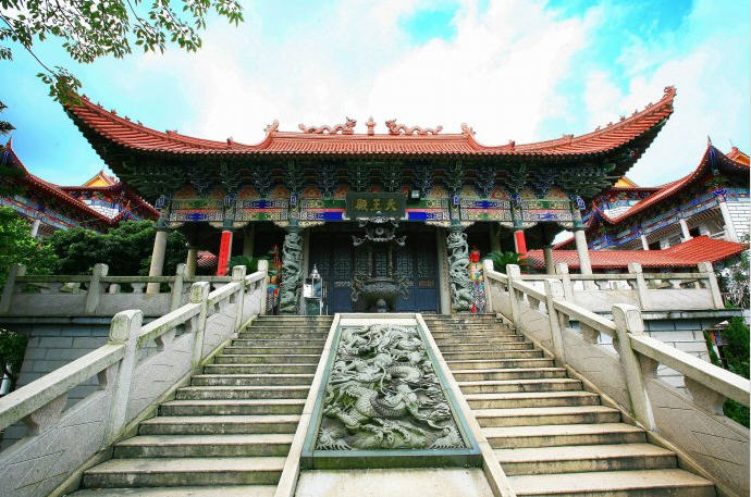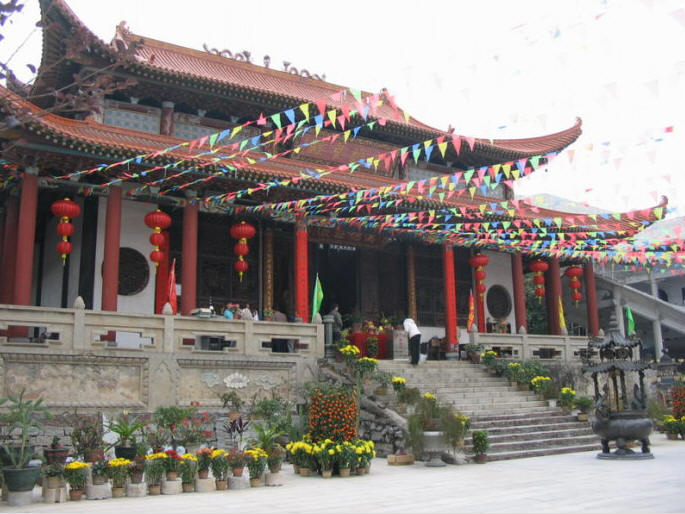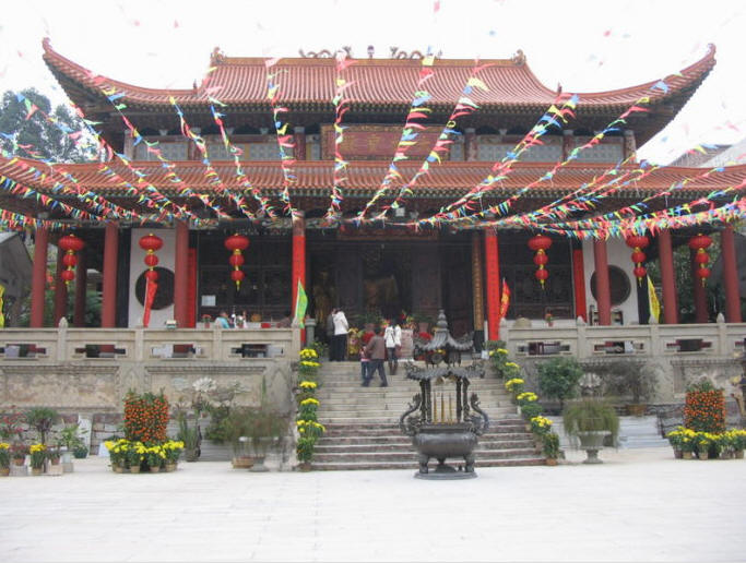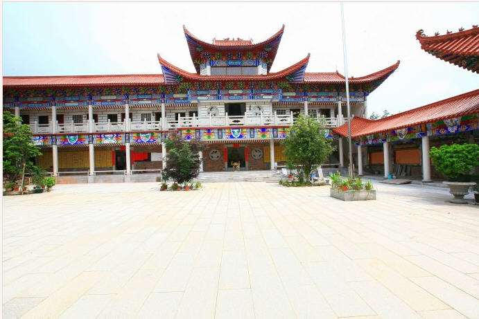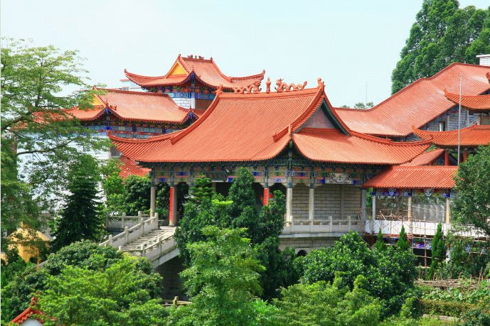 寺院依山而建,寺内绿树成荫,花香鸟语,环境清静幽雅,一幢幢皇宫式抛檐古建筑雄伟坐落在群山围护中,从山下往上眺望,黄瓦绿荫相互映衬,宛若人间仙境,目前是广东省内规模较大、各方面条件具足的十方尼众道场。