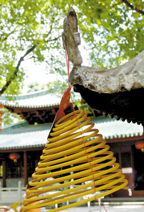 庭院里处处都是石凳,神情悠闲的人们坐在那里,享受着午后温暖的阳光。身穿金黄色袈裟的僧人不时地从眼前晃过,步履匆匆。大殿的一隅,两个年轻的小和尚拿着有拍照功能的手机,笑眯眯地在玩自拍。