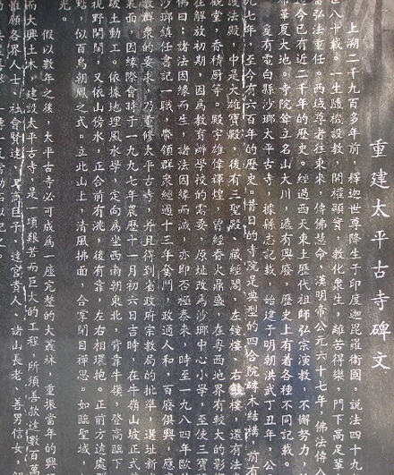 但於解放初期,教育办学,原址被政府征用改为沙朗中心小学,致使三宝隐没。因缘际会,一九九七年,应广大信教群众的要求,各级政府的努力,并得到省政府宗教事务局的批准,选址於镇新城公园内重建太平古寺,同年十一月初六正式奠基起建,建殿宇一座。