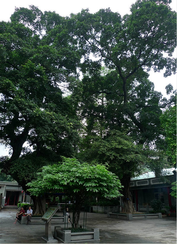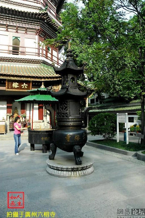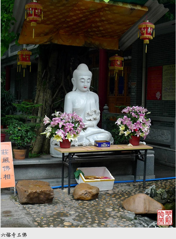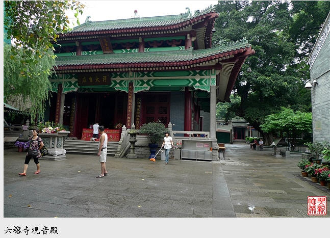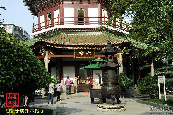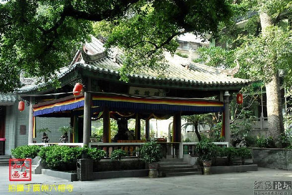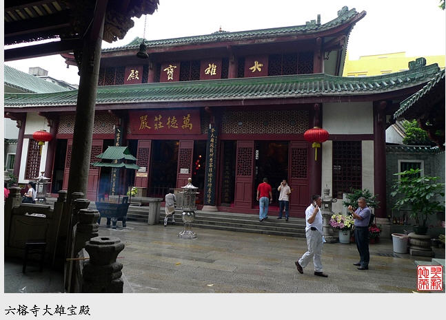 宋元符三年(1100年),苏轼来净慧寺留题墨宝“六榕”二大字,後寺僧榜诸山门,世间遂有“六榕寺”之称谓,但那时是俗称而已非寺名也。当时此寺有六株古榕,九口古井,至今尚存“吊碑井”於南墙外侧。清光绪元年(1875年),继咸同年间修建殿宇之後,重修千佛塔亦告竣工,此时撰《重修六榕寺佛塔记》,净慧寺始正式易名为六榕寺。
