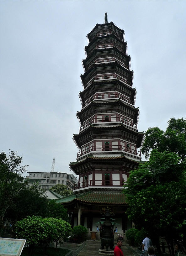 宋代广州净慧寺山门在今中山六路,明初割寺之半为永丰仓,山门亦在被割之列,洪武八年(1375年)在千佛东重建觉皇殿,改后山门东向。民国十年(1921年)起,广州市政府拆城筑路,在六榕寺东辟花塔街(今六榕路),明初所设山门又退缩与天王殿相连。花塔是一座四角形的六层木塔。