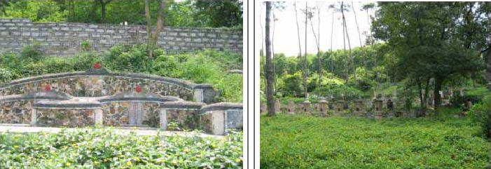 “寂静常乐”墓塔在墓园西北面,单重垅环形墓,垅环前两端立灰砂抱鼓,用麻石加灰砂砌筑墓壁,中立一“寂静常乐”青石墓碑,碑前墓圹内建一砂岩八角攒尖顶多层小石塔,高1.76米、身径0.6米、座宽0.64米。