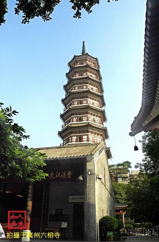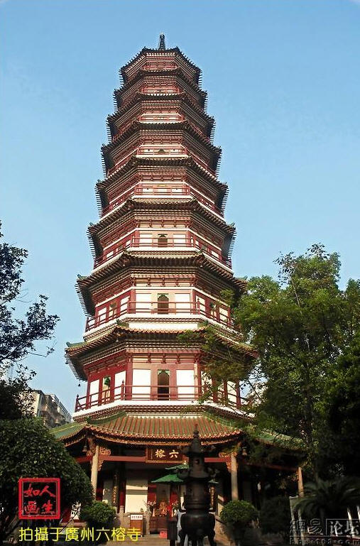 广州六榕寺早在南朝宋代(420一479年)已建有佛殿,称广州宝庄严寺。王勃《广州宝庄严寺舍利塔碑》有明确记载。梁大同三年(537年),内道场沙门昙裕法师奉命出使返至广州,因病淹留宝庄严寺,修书表示“愿居此刹”,得到诏许并筑舍利塔,塔下痉藏自海外求得之佛舍利。王勃《碑记》写道:“夫宝庄严寺舍利塔者,梁大同三年内道场沙门昙裕法师所立也......仍分舍利、俾宏真福。”
