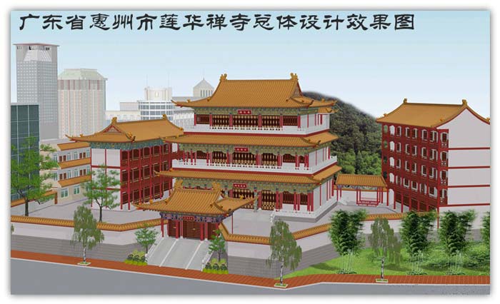 重新规划设计的莲华禅寺总建筑面积约5千平方米,依山就势,高下相望,将建造山门、天王殿、大雄宝殿、万佛殿、藏经楼,两侧分建客堂、流通处、僧寮、功德堂、斋堂、牌坊等配套设施。建成后的莲华禅寺将是楼阁重辉,殿宇堂皇,园林巧布,功能齐备,将成为具有更多文化内涵的现代化佛教道场。在保持佛教优秀传统、精神实质的同时,承载着更多的功能。必将成为佛教文化研究、地方文化建设之重镇,成为文明城市、园林城市——惠州的一个重要人文景观。我们相信千年名寺必将再现当年恢宏气象,并且重放光芒。