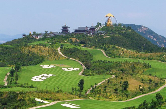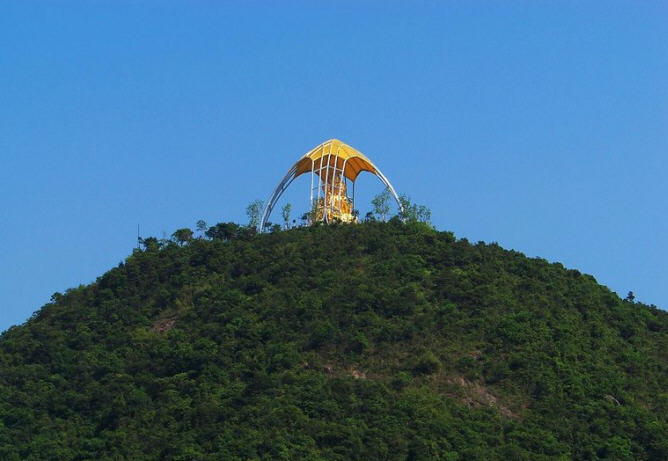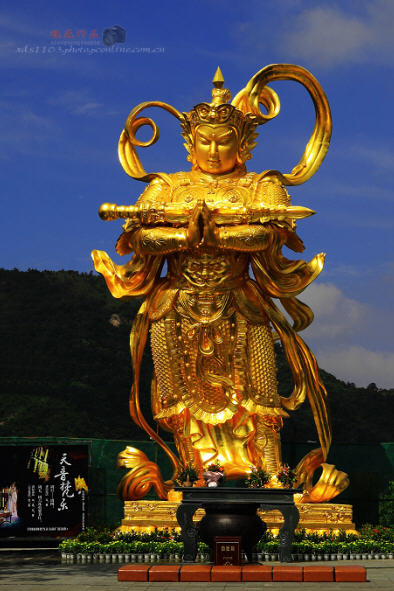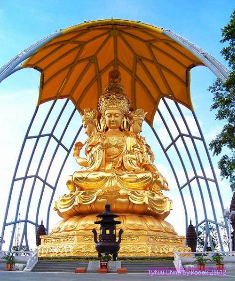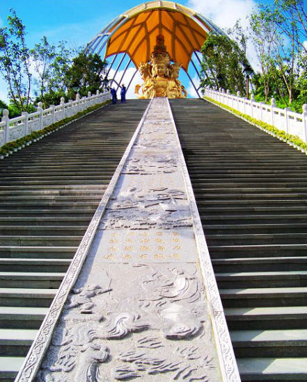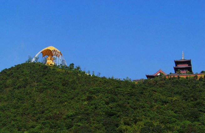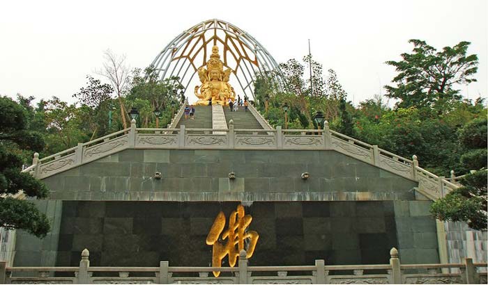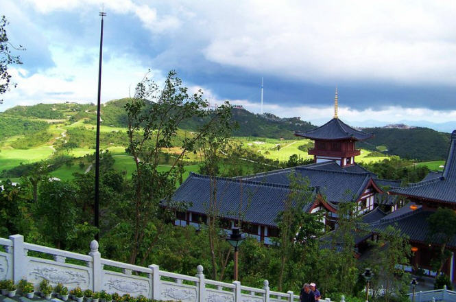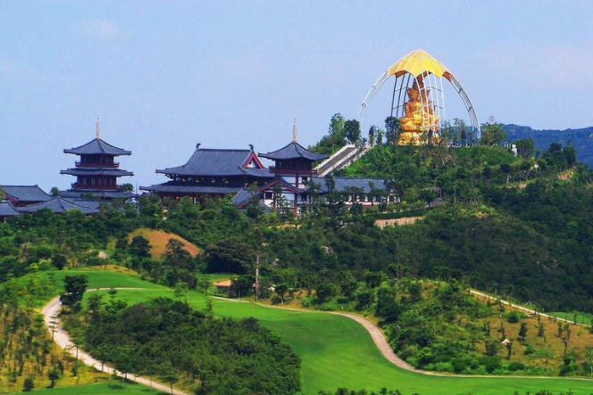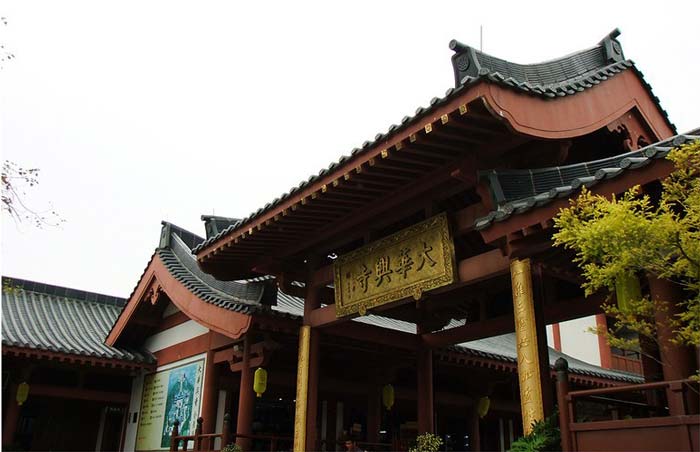 大华兴寺座落于深圳市盐田大梅沙东部华侨城天禅圣境景区大侠谷、茶溪谷、云海谷之间的观音山上,占地面积 12000平方米。寺院周围山环水绕,如一座莲台被四面山水簇拥。寺庙内是具有唐宋时期风格的建筑集群,主要建筑包括观音坐莲宝像、菩提宾舍、妙相禅境、大雄宝殿、众香界、香积斋、归一阁、云水堂等,终日梵音袅袅极乐世界的佛国景观。华兴寺中庄严美妙的“观音座莲”宝像、英俊威武的韦驮尊天菩萨像、独创梵呗文化音乐剧《天音梵乐》、健康素食馆香积斋等,通过建筑、造像、音乐、饮食等各种不同的方式,深度阐释了观世音菩萨、韦驮以及三洲田本土丰富的佛教文化内涵。其中造型绝伦美妙的观音座莲宝像,高23.3米,采用158吨仿金铜铸造而成。它是目前世界上最大的,也是唯一一座集四尊不同观音像为一体的大型佛像。