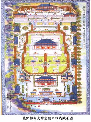 第二期工程计划是山门、天王殿、钟鼓楼、大雄宝殿、法堂和藏经阁。期中建设面积:山门 192 平方
