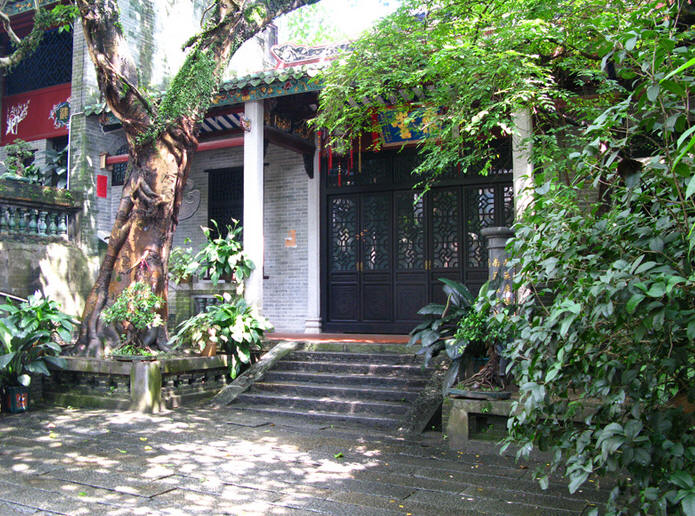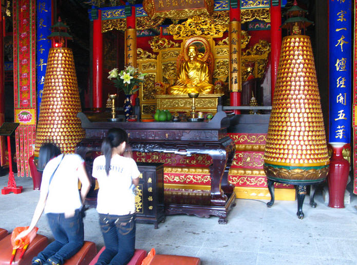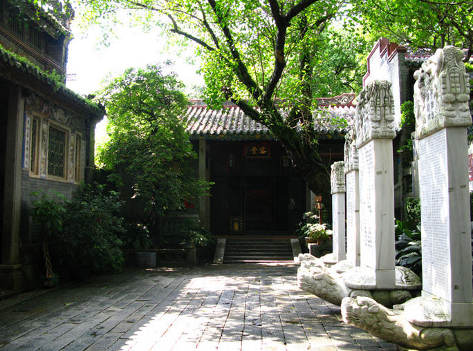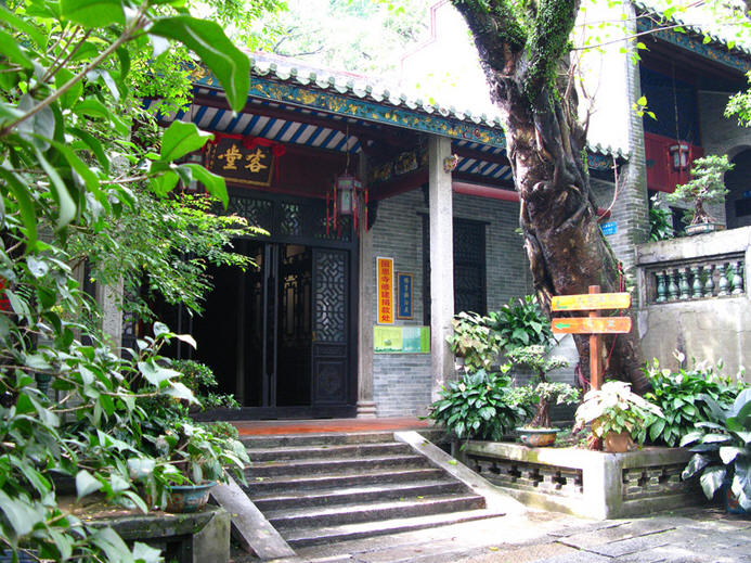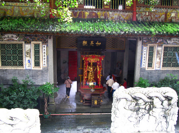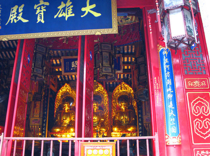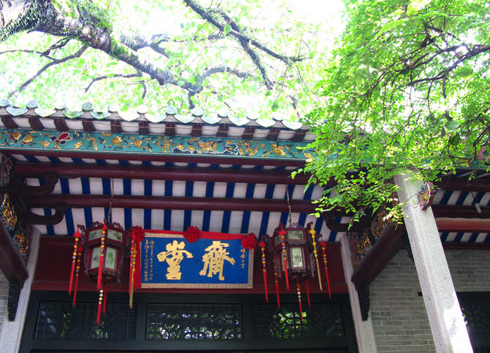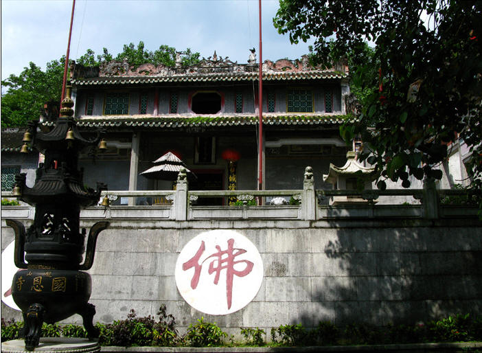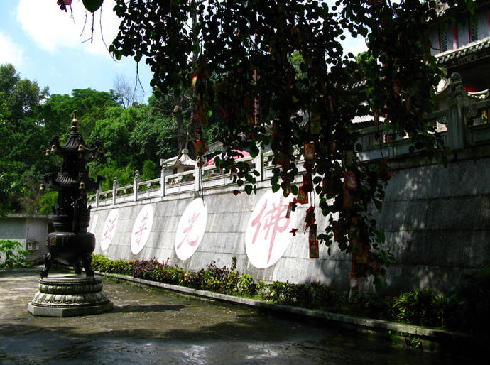 从天王殿中四位瞠目怒视人间万象的天王身边经过,肃穆紧张之感涌上心头。快步穿过天王殿,由中庭走上石阶长廊,大雄宝殿便矗立眼前。大雄宝殿正中供奉贴金释迦牟尼佛,左侧供奉消灾延寿药师佛,右侧供奉阿弥陀佛,20个罗汉像排坐于两边。殿前设有月台,两旁有石刻。殿内“朝朝朝朝朝敬朝朝朝敬,齊齊齋齊齊戒齊齊齋戒”的同字异音楹联,是乾隆三十五年(1770)木刻的,细细品读,禅意十足。斗拱及雀替雕刻龙、凤、鸟、鹿和卷云图案,工艺精美。整座大殿岭南建筑风格明显。