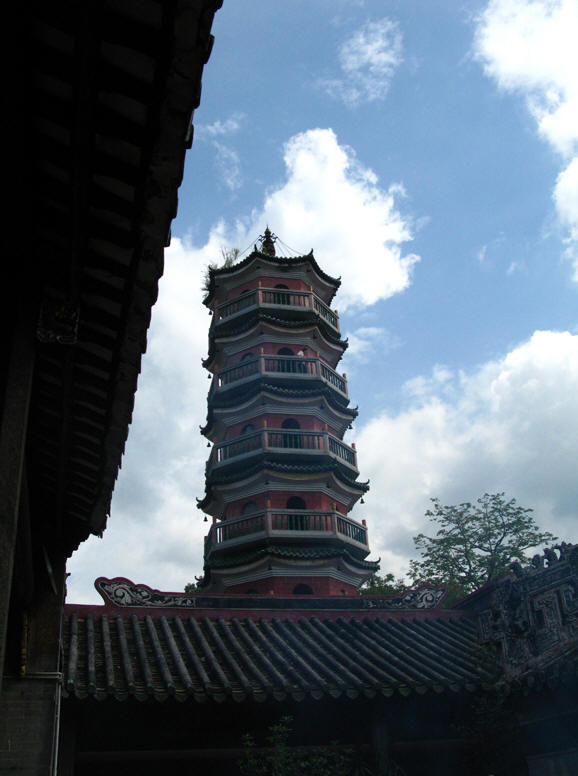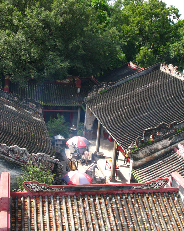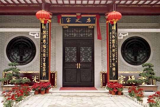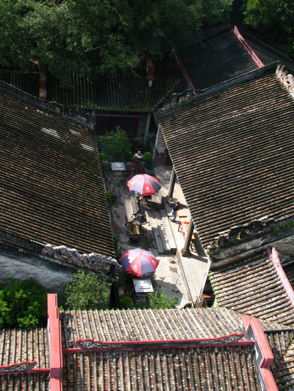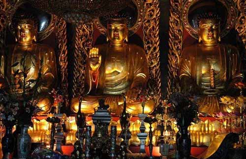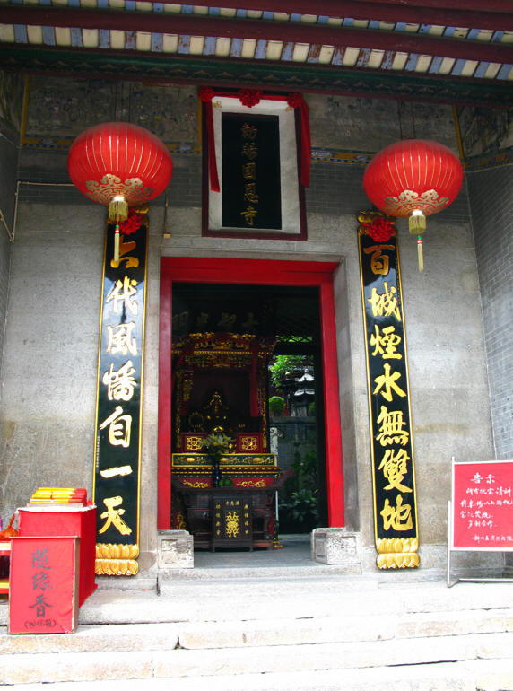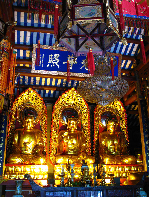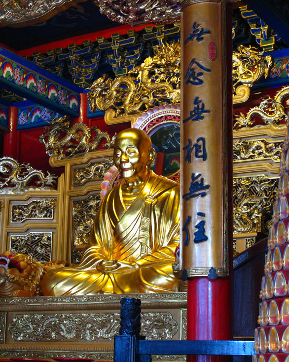 从天王殿中四位瞠目怒视人间万象的天王身边经过,肃穆紧张之感涌上心头。快步穿过天王殿,由中庭走上石阶长廊,大雄宝殿便矗立眼前。大雄宝殿正中供奉贴金释迦牟尼佛,左侧供奉消灾延寿药师佛,右侧供奉阿弥陀佛,20个罗汉像排坐于两边。殿前设有月台,两旁有石刻。殿内“朝朝朝朝朝敬朝朝朝敬,齊齊齋齊齊戒齊齊齋戒”的同字异音楹联,是乾隆三十五年(1770)木刻的,细细品读,禅意十足。斗拱及雀替雕刻龙、凤、鸟、鹿和卷云图案,工艺精美。整座大殿岭南建筑风格明显。