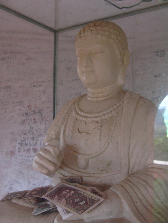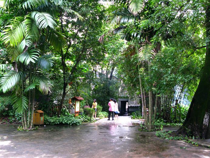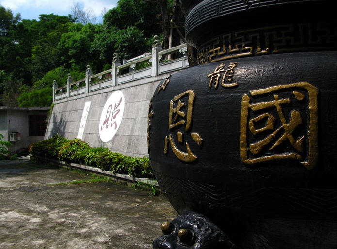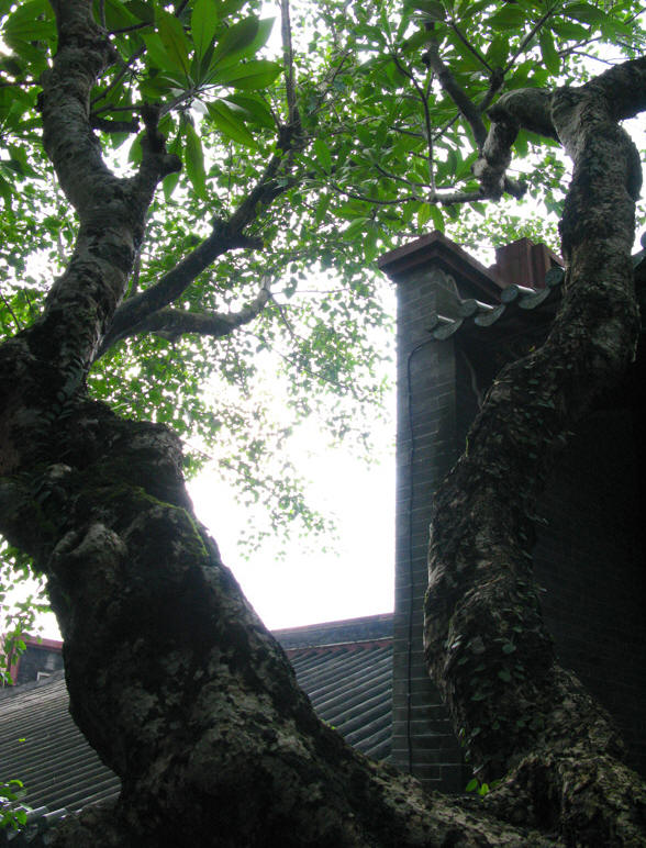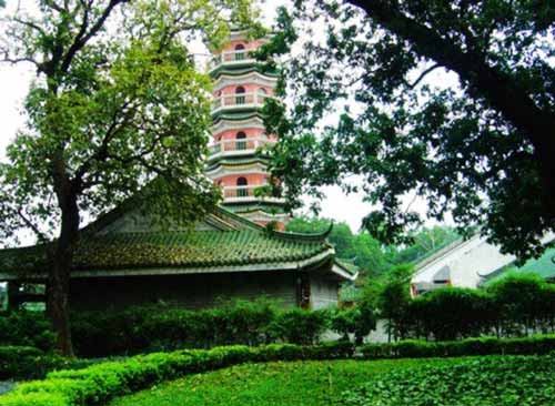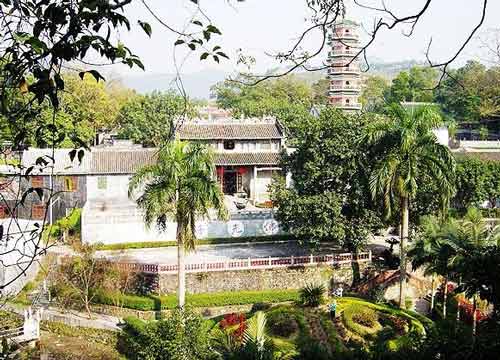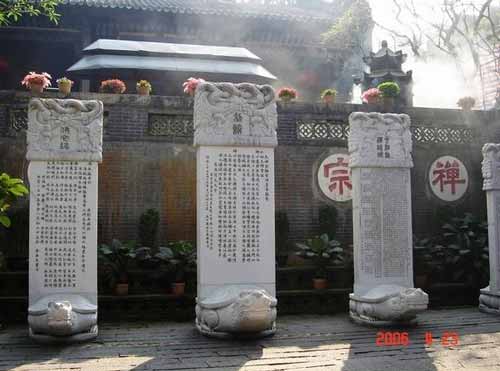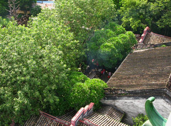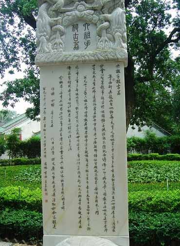 在国恩寺左上方,有一株高逾18米葱郁繁茂的千年古树,它就是名扬四海的六祖惠能手植千年佛荔。这株位列广东省18棵古树之首的佛荔,在每年荔枝成熟季节,殷红饱满的果实点缀在绿叶之间,愈加娇艳欲滴。清代举人陈在谦曾赋诗《六祖手植荔枝》一首。此诗1984年被刻于石上,竖于荔枝树下。仰望古树,阳光从青枝之间洒下来,变成了满地“星辰”。尽管主干要三个人才能合抱,但距离地面1米多高处已经中空,雨水可以直接从中渗人地面。据说这株古树颇有灵性。“文化大革命”时期,红卫兵曾经将柴草放人树根中一个自然形成的树洞,想要烧死它。但是,佛荔却如凤凰涅粲般在来年发出新芽,叶茂枝繁。