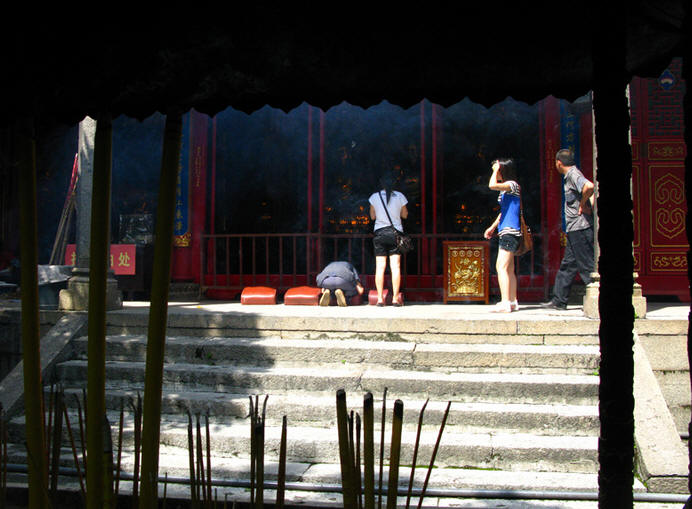 从大雄宝殿出来,依旧要穿过古朴的石阶长廊才能到达国恩寺后殿——六祖殿。六祖殿的建筑结构、布局,以及雕刻装饰都与大雄宝殿一致,六祖惠能像端坐殿中,神态安详超脱。