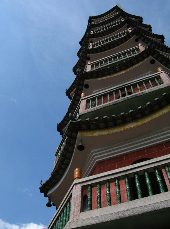 报恩塔位于国恩寺的左侧,是唐太极元年(712年)六祖惠能在宝林寺弘法时命门人回新兴历时一年所建。报恩塔之名取六祖的“报四恩”(父母恩、国家恩、众生恩、老师(师傅)恩)之意。此后,报恩塔历经沉浮,先后多次崩塌、修复,至清代古塔完全崩毁,仅存塔基、塔砖。1989年,数度崩毁的报恩塔得以在原址上重建,恢复昔日风采。整座塔高达28.88米,七层结构,呈八角形。塔门匾额“报恩塔”三个大字为中国佛教协会原会长赵朴初手书。塔身所绘的释迦牟尼弟子初祖迦叶至二十八代祖师达摩的28尊石像栩栩如生。另外,塔里每一层还藏有手印各异的地藏白玉佛一尊。