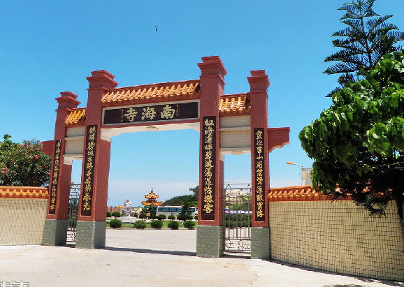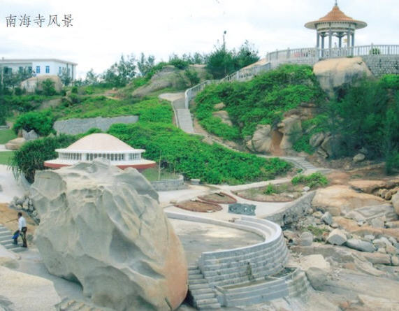 南海寺,位于红海湾遮浪岛东侧打石澳。寺区占地面积30万平方米。这里岬屿相连,礁岩叠兀,港湾交错,风景美丽,相传观世音在此地得度成正果,成为四大菩萨之一,并因此留下许多与神奇传说有关的圣迹。主要圣迹景点有“佛留沙”、“佛印石”、“得度石”、“莲花石”、“甘露泉”、“柳基”、“郑成功后江平水”等。登寺远眺,大海茫茫,水天一色;近观白沙湖,澄静如镜,舟楫如梭;漫步于礁屿岬岩之间,各种圣迹奇景令人心旷神怡,流连忘返。