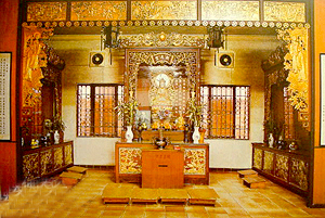 三楼大厅贯通四楼,一方形龛二层楼高,刻“万德庄严”匾额,四周雕龙镂凤。龛内供缅甸汉白玉释迦牟尼佛,高二米,重两吨,价值约40万人民币。龛右设“廷生堂”,由木料制造,精雕细刻。厅左供韦陀,右供伽蓝。两边墙上十八幅罗汉国画,是四川著名画家所作,形态各异,栩栩如生为当代美术珍品。厅内有名人题联,如赵朴初先生题“文宇结殊胜因缘广开法藏,珠网现恒沙世界无尽庄严”;广东省人大常委、省佛教协会会长云峰法师题“福海有慈航普.度众生登觉岸,寿山迎玉佛重光古寺振宗风”;香港大屿山宝莲寺住持初慧法师题“文风遍沭须弥界,珠色堂观帝纲宫”;正门外走廓遍布名花瑞草,门额“大雄宝殿”由中国佛教协会副会长明赐题书,楹联;“佛日高悬普照大干恒沙众生登觉岸,法轮常转圆音演畅无量含识契真如”,系文珠法师撰文,区董立书写。四楼设藏经阁等。