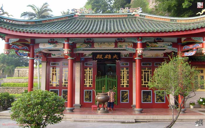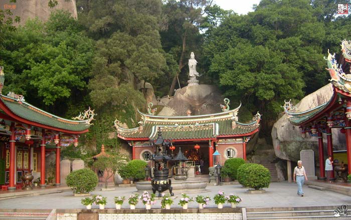 圆通宝殿,坐西向东。原为巨岩嵌空的石室,今“殿”前建一拜亭,石洞外表俨然“殿堂”,三开间,歇山顶,屋盖铺设绿色琉璃瓦,洞岩之上,安置一尊白石观音立像,供善男信女顶礼膜拜。