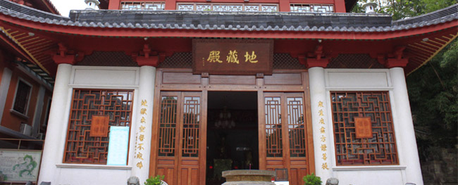 地藏殿主供地藏菩萨,是佛寺的重要配殿之一。根据《地藏十轮经》载,地藏菩萨的名号来历于"安忍不动犹如大地,静虑深密犹如宝藏",“地”表大地安忍不动之意,“藏”表深静密虑之意,其名号正显发菩萨心地之果证。地藏王菩萨是佛教四大菩萨之一,《地藏菩萨本愿经》载,地藏菩萨受释迦牟尼佛嘱咐,于释迦牟尼佛入寂后,弥勒佛未出世之前尽度一切众生悲苦。地藏接受了嘱咐,在忉利天当着释迦牟尼发出大愿:“为是罪苦六道众生广设方便,尽解脱,而我自身方成佛道”故其美称为“大愿地藏”。地藏菩萨作比丘形,头戴毗卢冠,身披袈裟,这是因为地藏菩萨在 “五浊恶世”(劫浊、见浊、烦恼浊、众生浊、命浊)中济渡众生,为了使众生能深信正法,尊敬三宝,所以显现出家比丘之相。结跏趺坐,右手持锡杖,表爱护众生,也表示戒修精严;左手持如意宝珠,表示满足众生愿望。两边胁侍为闵长者和道明和尚,边上俯卧的是地藏菩萨的坐骑“谛听”。这就是“金地藏”像。相传唐代新罗一王子出家,名叫金地藏,后来来到我国安徽九华山,受到当地闵长者的供养。闵长者的儿子从他出家,法名道明。后人便将“金地藏”看作地藏菩萨的化身,闵长者父子成为地藏的胁侍,而九华山就成为地藏菩萨的应化之地。地藏菩萨之法身实充遍于宇宙六道之间,只要有人能读诵《地藏菩萨本愿经》,抑是其他大乘经典,还是念诸佛菩萨名号;地藏菩萨便能显其大神力,亲领欲被超渡之祖先、眷属及诸恶道众生,至其跟前随诵佛经,直到心地清净,大放光明,得到解脱境界为止。地藏菩萨的本怀,是化渡众生,包括六道一切有情之类,其誓愿乃永存不灭。